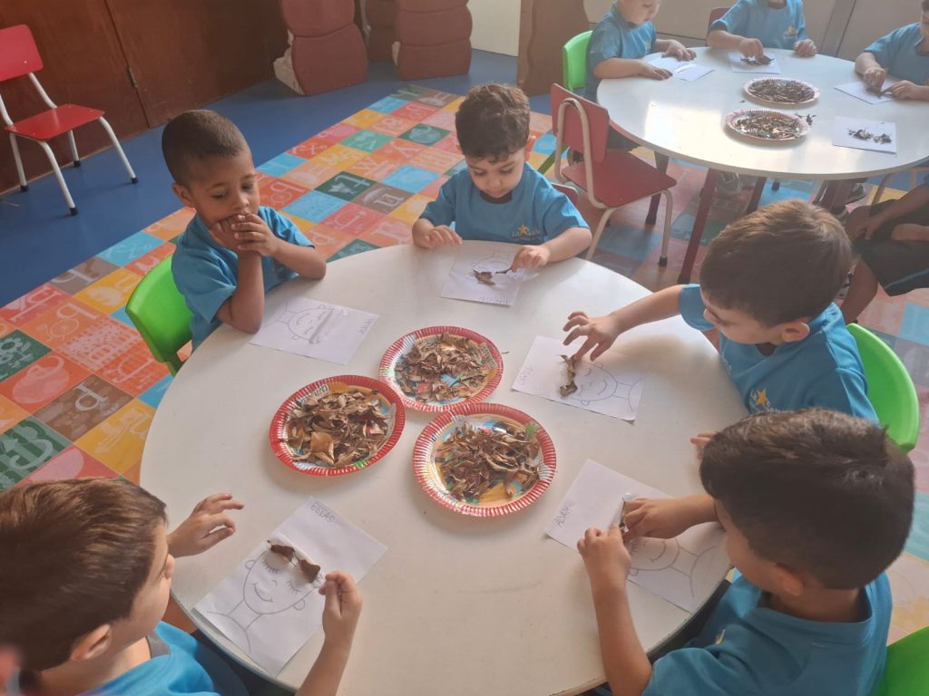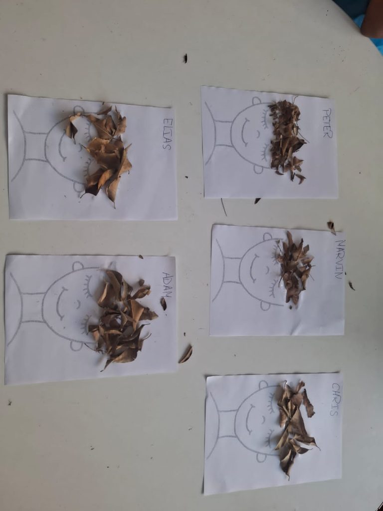 Ils ont ramassé des feuilles mortes, observé leurs couleurs, puis les ont collées pour créer des cheveux drôles.