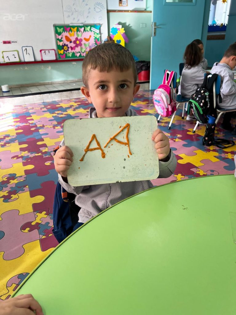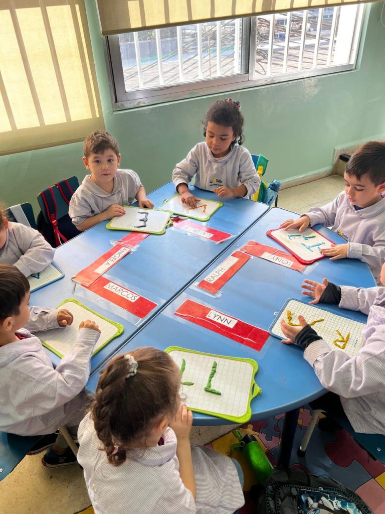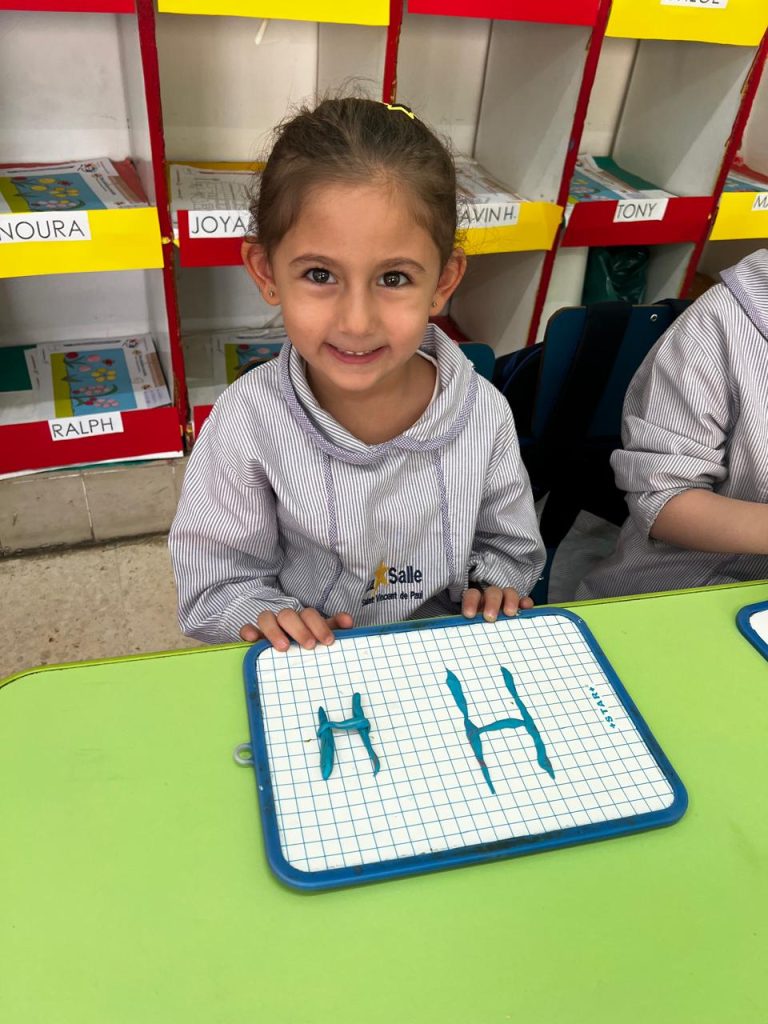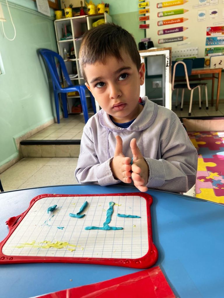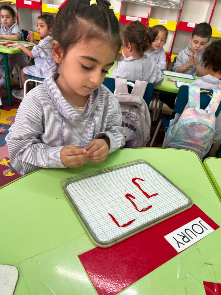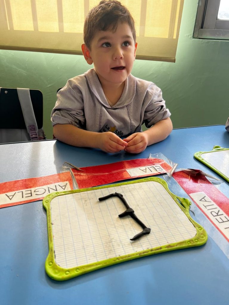 Activité ciblée autour de la lettre initiale du prénom : les enfants en moyenne section manipulent la pâte à modeler pour former leur lettre, renforçant à la fois la reconnaissance visuelle et la coordination motrice. Une étape clé vers l’entrée dans l’écrit.