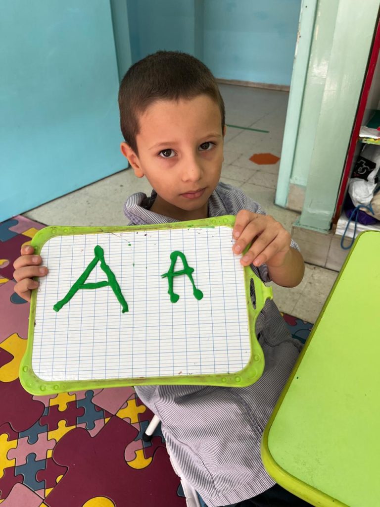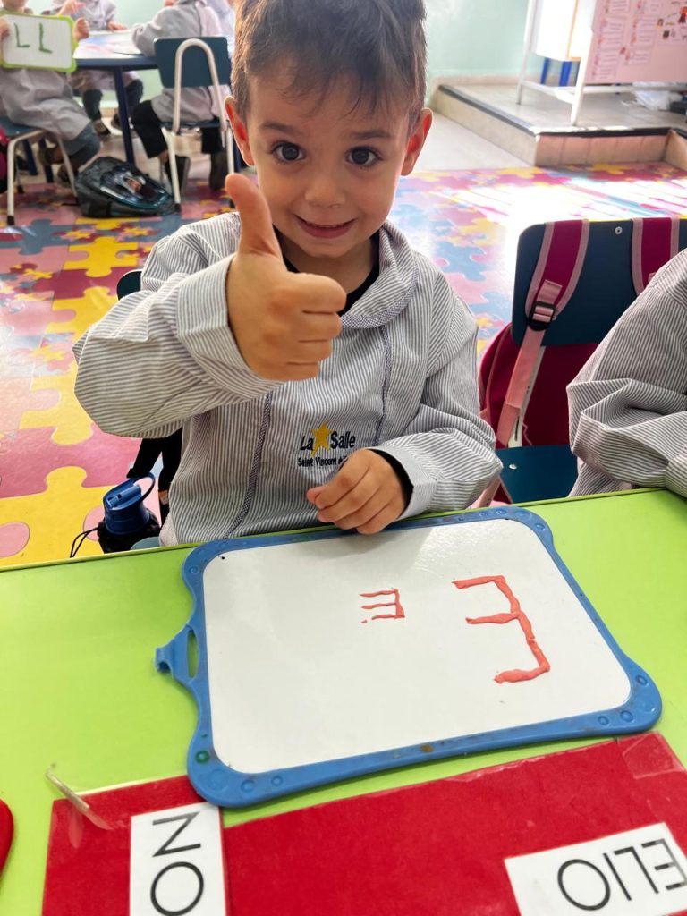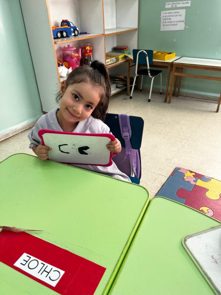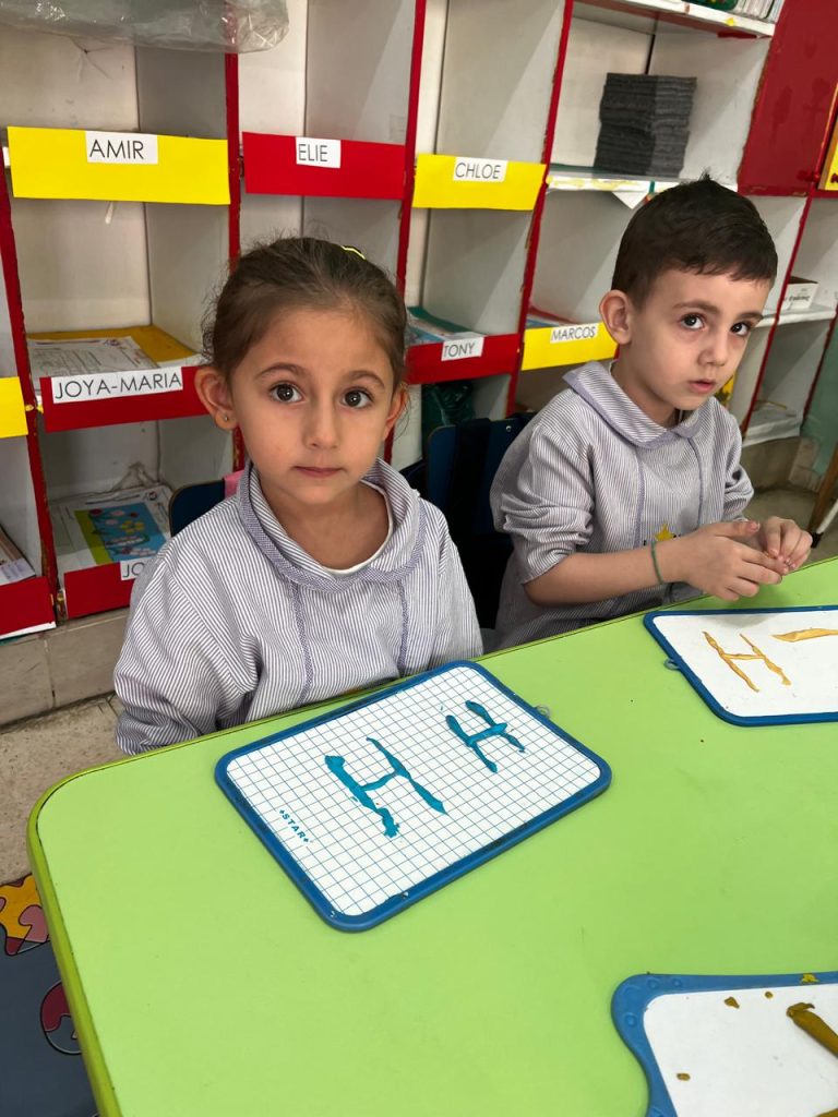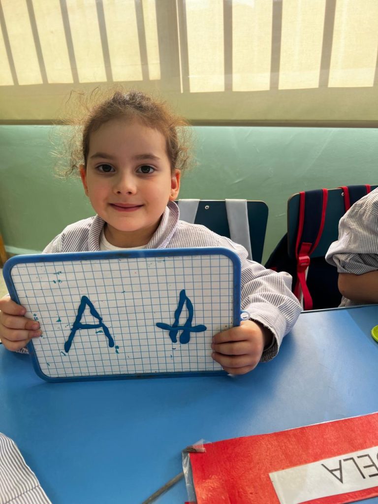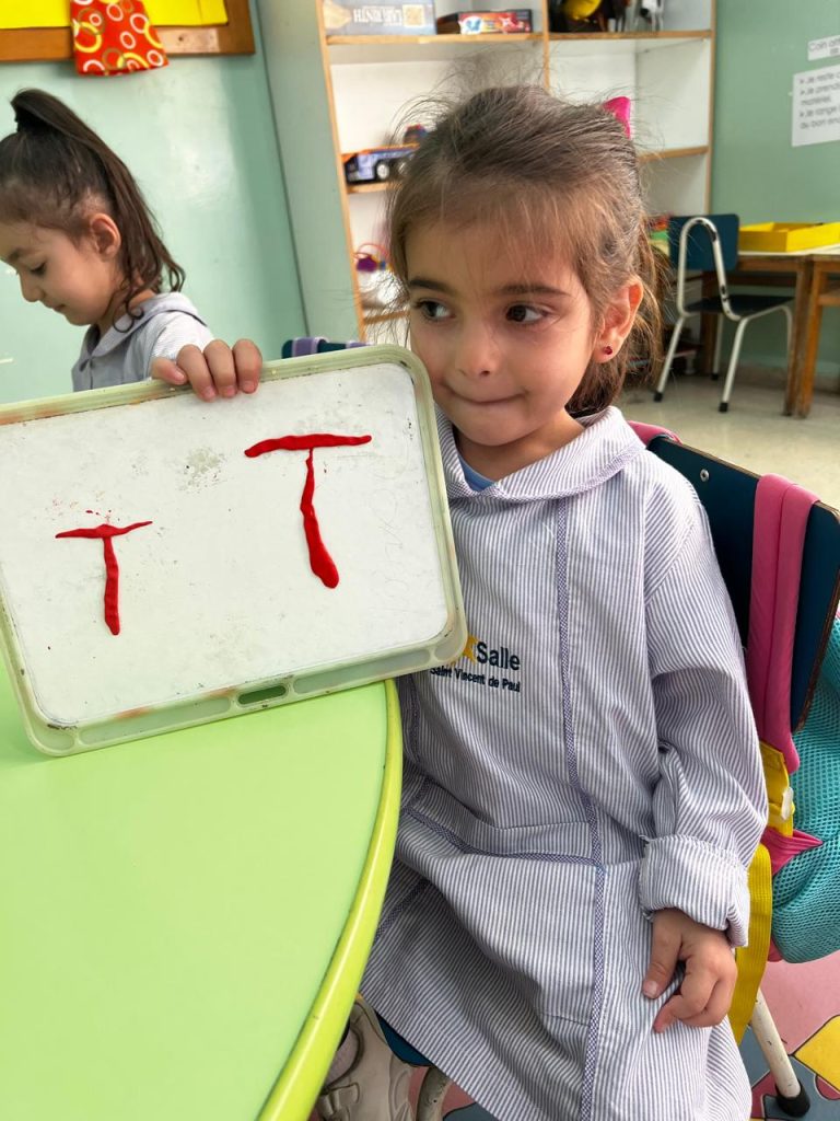 Activité ciblée autour de la lettre initiale du prénom : les enfants en moyenne section manipulent la pâte à modeler pour former leur lettre, renforçant à la fois la reconnaissance visuelle et la coordination motrice. Une étape clé vers l’entrée dans l’écrit.